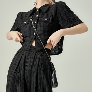 ショート丈のシャツとワイドパンツの組み合わせは、快適さを保ちながらもおしゃれさを実現。