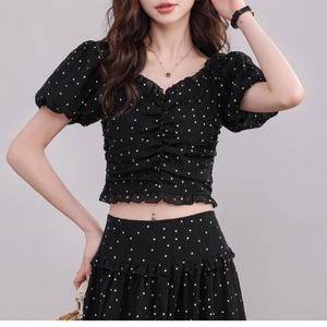 トップスはギャザーとフリルで、上半身をふんわり華やかに演出。