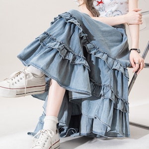 ティアードデニムフレアロングスカート