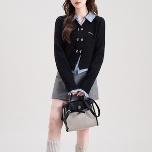 カーデ×シャツのフェイクツーピースで、上品な印象に。