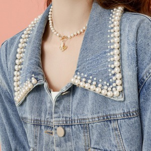 パールで縁取られた襟とポケットが目を惹く、上品フェミニンなデニムジャケット。