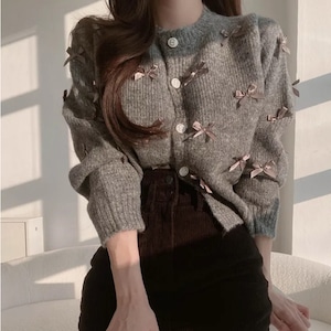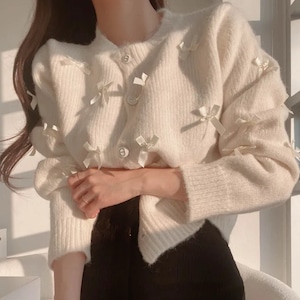 リボンモチーフ 長袖 ニット カーディガン (3color)