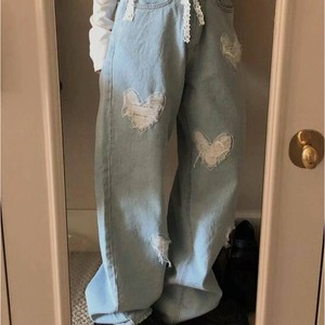 ハート型のダメージデザインが特徴で、個性的なスタイルを演出しつつもリラックス感のあるワイドシルエットが魅力です。