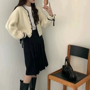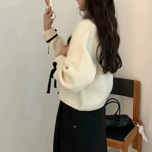 バイカラー 長袖 袖リボン カーディガン