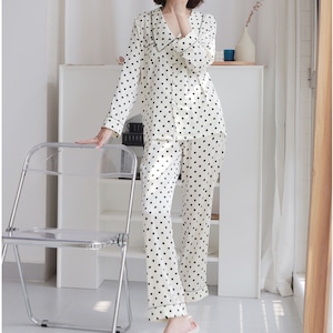 大きめの衿が愛らしく、上品なドット柄が目を惹くルームウェア。