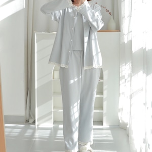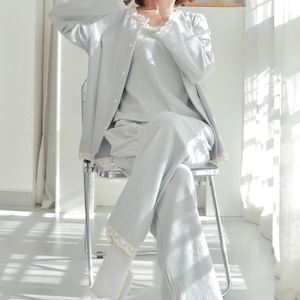 このルームウェアは、胸パッド入りキャミソール、カーディガン、ロングパンツの3点セットで、シンプルながらも華やかさ漂うアイテムです!