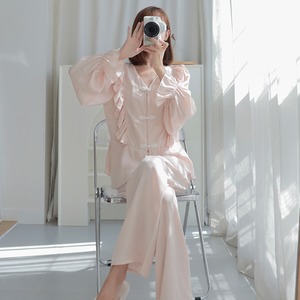 上品な光沢感と、華やかなフリル袖が目を惹くルームウェア。
