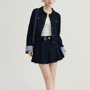 上品なプリーツと、ウエストマークできるベルト付きデザインが魅力のデニムミニスカート。